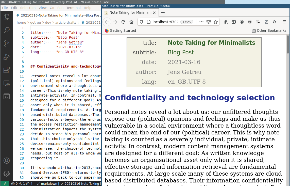 Tp-Note is a note-taking-tool and a template system - freely available for Windows, MacOS and Linux - that consistently synchronizes the note’s meta-data with its filename. If you like to keep your notes next to your files and you care about expressive filenames, then Tp-Note might be the tool of your choice. Tp-Note collects various information about its environment and the clipboard and stores them in variables. New notes are created by filling these variables in predefined and customizable Tera-templates. TP-Note’s default templates are written in Markdown and can be easily adapted to any other markup language if needed. After creating a new note, TP-Note launches the system file editor (or any other of your choice, e.g. MarkText or Typora) and connects the default web browser to Tp-Note’s internal Markdown/RestructuredText renderer and web server. The viewer detects note file changes and updates the rendition accordingly.